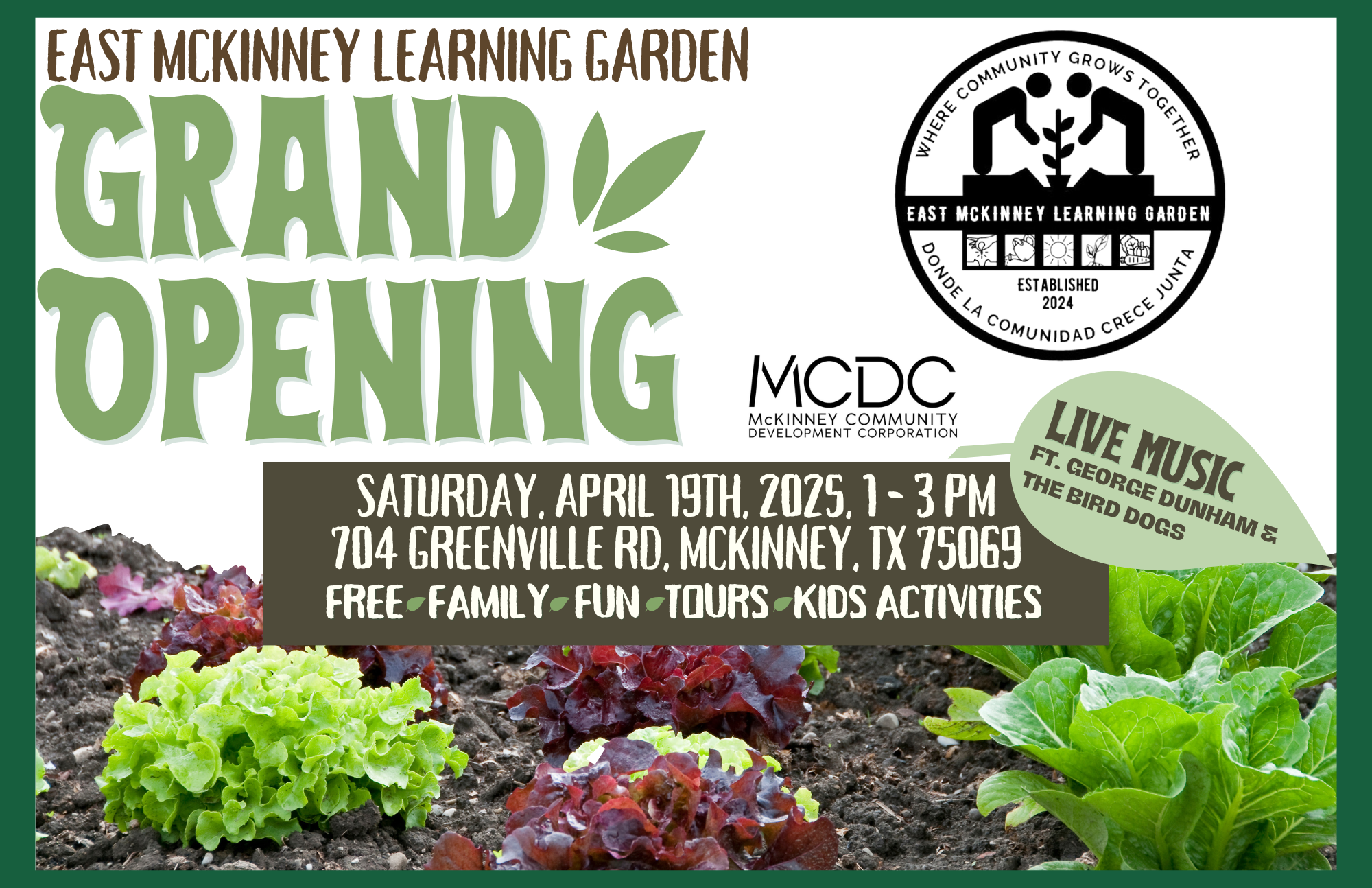 Join us for the Grand Opening of the East McKinney Learning Garden on Saturday, April 19th, 2025, 1-3 PM, 704 Greenville Rd, McKinney, TX! Enjoy live music, family fun, garden tours, and kids’ activities as we celebrate this new community space dedicated to sustainable gardening and food education.
