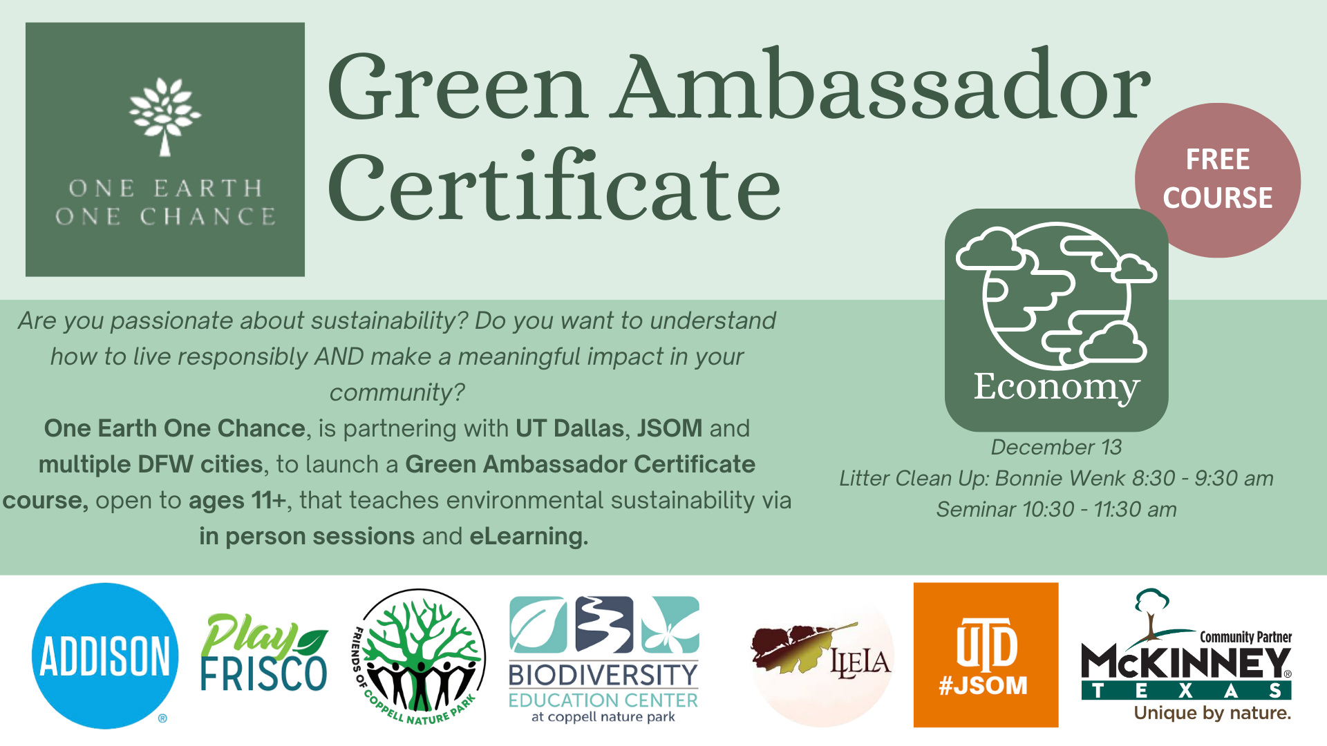 Explore sustainability and local action at McKinney City Hall through this new seminar, part of the Green Ambassador Certificate Program, a community education series launched by One Earth One Chance in partnership with UTD and several other DFW cities.