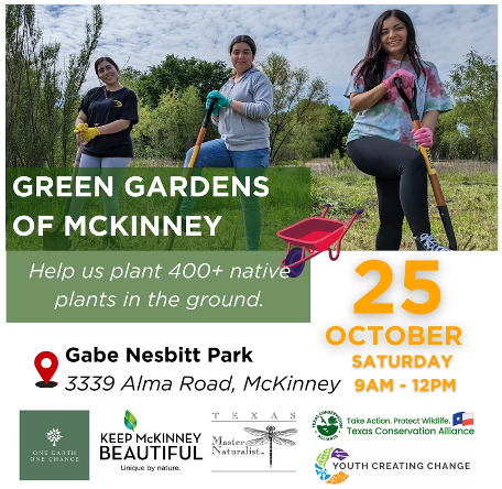 This community event is hosted by Blackland Prairie Master Naturalists, Keep McKinney Beautiful, Youth Creating Change, One Earth One Chance, and Texas Conservation Alliance. Whether you're an experienced gardener or new to planting, all are welcome to roll up their sleeves and make a lasting impact!