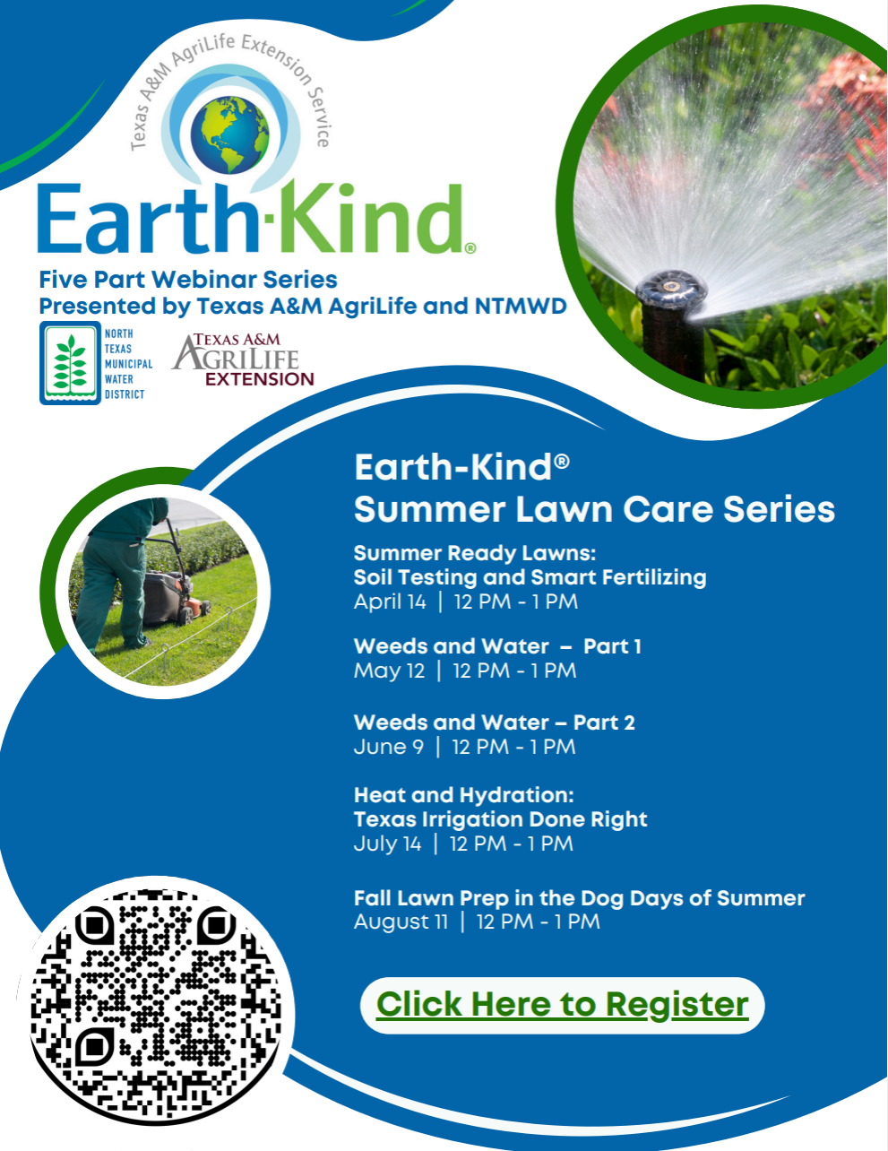 The North Texas Municipal Water District is partnering with Texas A&M AgriLife Extension to host a Summer Lawn Care Series of free lunch-hour webinars. Earth-Kind is a sustainable landscaping system that promotes a balanced landscape ecosystem that conserves water and protects the environment through the judicious use of landscape irrigation, pesticides and fertilizers. This webinar series, each taking place Noon - 1 p.m., will teach you how to improve your lawn’s performance and reduce maintenance while conserving precious water and reducing fertilizer and pesticide usage.